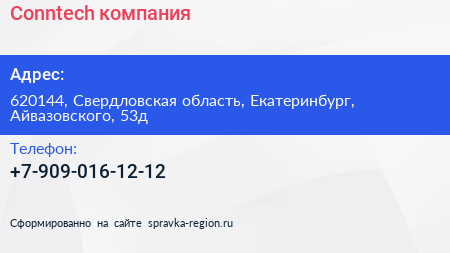Conntech, компания по адресу 620144, Свердловская область, Екатеринбург, Айвазовского, 53д в дальнейшем Организация, размещена в следующих категориях: