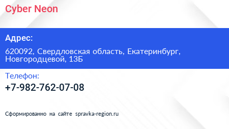 Cyber Neon по адресу 620092, Свердловская область, Екатеринбург, Новгородцевой, 13Б в дальнейшем Организация, размещена в следующих категориях: