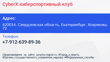 CyberX, киберспортивный клуб по адресу 620014, Свердловская область, Екатеринбург, Хохрякова, 72 в дальнейшем Организация, размещена в следующих категориях: