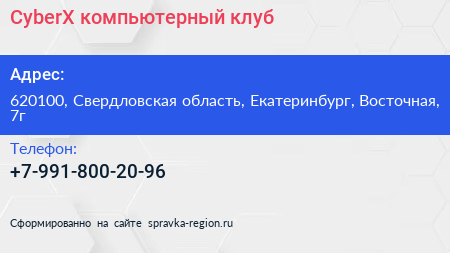 CyberX, компьютерный клуб по адресу 620100, Свердловская область, Екатеринбург, Восточная, 7г в дальнейшем Организация, размещена в следующих категориях: