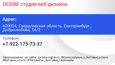 DESIRE, студия веб-дизайна по адресу 620014, Свердловская область, Екатеринбург, Добролюбова, 16/2 в дальнейшем Организация, размещена в следующих категориях: