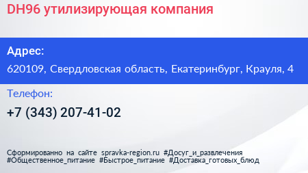 DH96, утилизирующая компания по адресу 620109, Свердловская область, Екатеринбург, Крауля, 4 в дальнейшем Организация, размещена в следующих категориях: