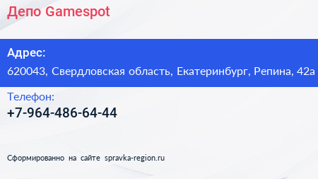 Депо Gamespot по адресу 620043, Свердловская область, Екатеринбург, Репина, 42а в дальнейшем Организация, размещена в следующих категориях: