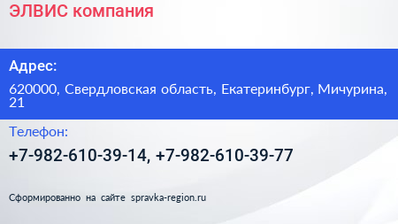 ЭЛВИС, компания по адресу 620000, Свердловская область, Екатеринбург, Мичурина, 21 в дальнейшем Организация, размещена в следующих категориях: