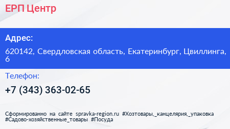 ЕРП Центр по адресу 620142, Свердловская область, Екатеринбург, Цвиллинга, 6 в дальнейшем Организация, размещена в следующих категориях: