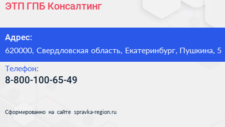 ЭТП ГПБ Консалтинг по адресу 620000, Свердловская область, Екатеринбург, Пушкина, 5 в дальнейшем Организация, размещена в следующих категориях: