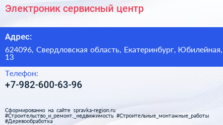 Электроник, сервисный центр по адресу 624096, Свердловская область, Екатеринбург, Юбилейная, 13 в дальнейшем Организация, размещена в следующих категориях: