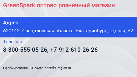 GreenSpark, оптово-розничный магазин по адресу 620142, Свердловская область, Екатеринбург, Щорса, 62 в дальнейшем Организация, размещена в следующих категориях: