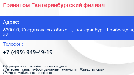 Гринатом, Екатеринбургский филиал по адресу 620010, Свердловская область, Екатеринбург, Грибоедова, 32 в дальнейшем Организация, размещена в следующих категориях: