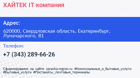 ХАЙТЕК, IT-компания по адресу 620000, Свердловская область, Екатеринбург, Луначарского, 81 в дальнейшем Организация, размещена в следующих категориях: