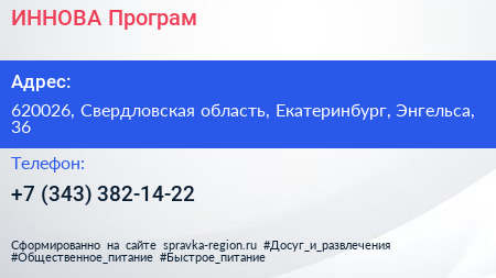 ИННОВА Програм по адресу 620026, Свердловская область, Екатеринбург, Энгельса, 36 в дальнейшем Организация, размещена в следующих категориях:
