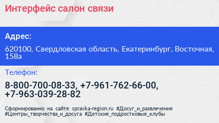 Интерфейс, салон связи по адресу 620100, Свердловская область, Екатеринбург, Восточная, 158а в дальнейшем Организация, размещена в следующих категориях: