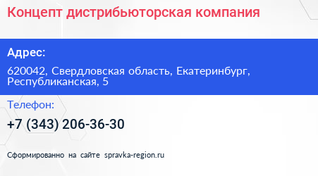 Концепт, дистрибьюторская компания по адресу 620042, Свердловская область, Екатеринбург, Республиканская, 5 в дальнейшем Организация, размещена в следующих категориях: