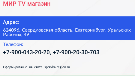 МИР TV, магазин по адресу 624096, Свердловская область, Екатеринбург, Уральских Рабочих, 49 в дальнейшем Организация, размещена в следующих категориях: