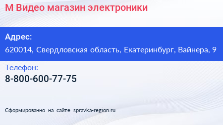 M.Видео, магазин электроники по адресу 620014, Свердловская область, Екатеринбург, Вайнера, 9 в дальнейшем Организация, размещена в следующих категориях: