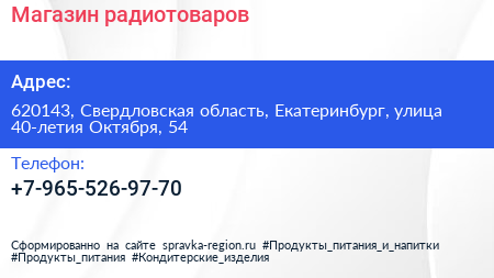 Магазин радиотоваров по адресу 620143, Свердловская область, Екатеринбург, улица 40-летия Октября, 54 в дальнейшем Организация, размещена в следующих категориях: