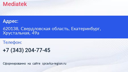 Mediatek по адресу 620138, Свердловская область, Екатеринбург, Хрустальная, 49а в дальнейшем Организация, размещена в следующих категориях: