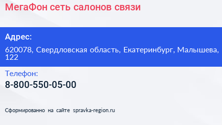 МегаФон, сеть салонов связи по адресу 620078, Свердловская область, Екатеринбург, Малышева, 122 в дальнейшем Организация, размещена в следующих категориях: