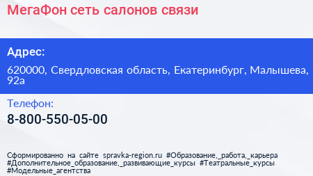 МегаФон, сеть салонов связи по адресу 620000, Свердловская область, Екатеринбург, Малышева, 92а в дальнейшем Организация, размещена в следующих категориях: