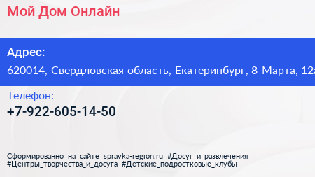 Мой Дом Онлайн по адресу 620014, Свердловская область, Екатеринбург, 8 Марта, 12а в дальнейшем Организация, размещена в следующих категориях: