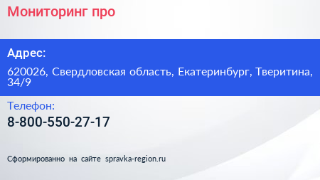 Мониторинг-про по адресу 620026, Свердловская область, Екатеринбург, Тверитина, 34/9 в дальнейшем Организация, размещена в следующих категориях: