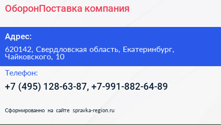 ОборонПоставка, компания по адресу 620142, Свердловская область, Екатеринбург, Чайковского, 10 в дальнейшем Организация, размещена в следующих категориях: