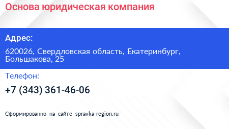 Основа, юридическая компания по адресу 620026, Свердловская область, Екатеринбург, Большакова, 25 в дальнейшем Организация, размещена в следующих категориях: