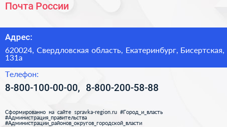 Почта России по адресу 620024, Свердловская область, Екатеринбург, Бисертская, 131а в дальнейшем Организация, размещена в следующих категориях: