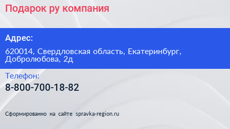 Подарок.ру, компания по адресу 620014, Свердловская область, Екатеринбург, Добролюбова, 2д в дальнейшем Организация, размещена в следующих категориях: