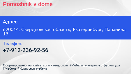 Pomoshnik v dome по адресу 620014, Свердловская область, Екатеринбург, Папанина, 19 в дальнейшем Организация, размещена в следующих категориях: