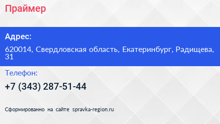 Праймер по адресу 620014, Свердловская область, Екатеринбург, Радищева, 31 в дальнейшем Организация, размещена в следующих категориях: