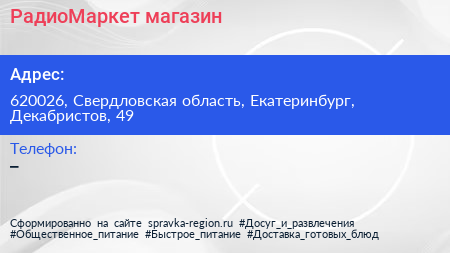 РадиоМаркет, магазин по адресу 620026, Свердловская область, Екатеринбург, Декабристов, 49 в дальнейшем Организация, размещена в следующих категориях: