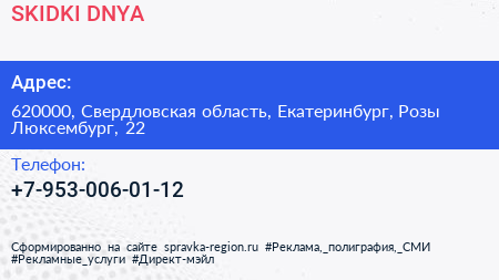 SKIDKI-DNYA по адресу 620000, Свердловская область, Екатеринбург, Розы Люксембург, 22 в дальнейшем Организация, размещена в следующих категориях: