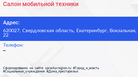 Салон мобильной техники по адресу 620027, Свердловская область, Екатеринбург, Вокзальная, 22 в дальнейшем Организация, размещена в следующих категориях: