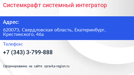 Системкрафт, системный интегратор по адресу 620073, Свердловская область, Екатеринбург, Крестинского, 46а в дальнейшем Организация, размещена в следующих категориях: