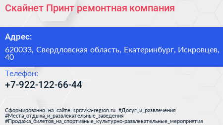 Скайнет Принт, ремонтная компания по адресу 620033, Свердловская область, Екатеринбург, Искровцев, 40 в дальнейшем Организация, размещена в следующих категориях: