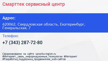 Смарттек, сервисный центр по адресу 620062, Свердловская область, Екатеринбург, Генеральская, 7 в дальнейшем Организация, размещена в следующих категориях: