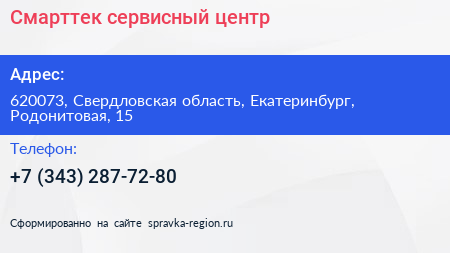 Смарттек, сервисный центр по адресу 620073, Свердловская область, Екатеринбург, Родонитовая, 15 в дальнейшем Организация, размещена в следующих категориях: