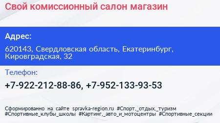 Свой, комиссионный салон-магазин по адресу 620143, Свердловская область, Екатеринбург, Кировградская, 32 в дальнейшем Организация, размещена в следующих категориях: