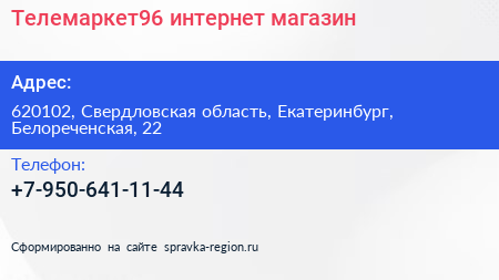 Телемаркет96, интернет-магазин по адресу 620102, Свердловская область, Екатеринбург, Белореченская, 22 в дальнейшем Организация, размещена в следующих категориях: