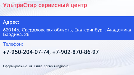 УльтраСтар, сервисный центр по адресу 620146, Свердловская область, Екатеринбург, Академика Бардина, 28 в дальнейшем Организация, размещена в следующих категориях: