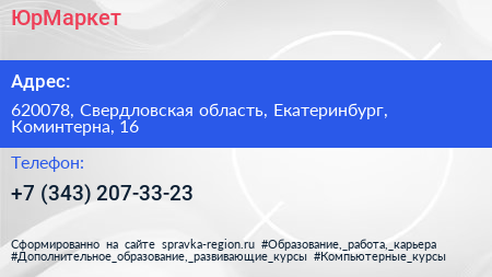 ЮрМаркет по адресу 620078, Свердловская область, Екатеринбург, Коминтерна, 16 в дальнейшем Организация, размещена в следующих категориях: