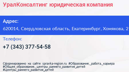 Для связи с организацией воспользуйтесь номером телефона: +7 (343) 377-54-58. Пн: c 09:00-18:00, Вт: c 09:00-18:00, Ср: c 09:00-18:00, Чт: c 09:00-18:00, Пт: c 09:00-18:00, Сб: выходной, Вс: выходной, вы можете обратиться в эту организацию.