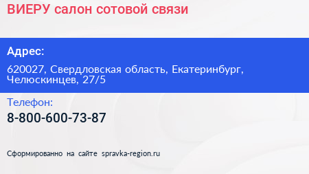 ВИЕРУ, салон сотовой связи по адресу 620027, Свердловская область, Екатеринбург, Челюскинцев, 27/5 в дальнейшем Организация, размещена в следующих категориях: