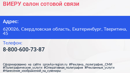 ВИЕРУ, салон сотовой связи по адресу 620026, Свердловская область, Екатеринбург, Тверитина, 45 в дальнейшем Организация, размещена в следующих категориях: