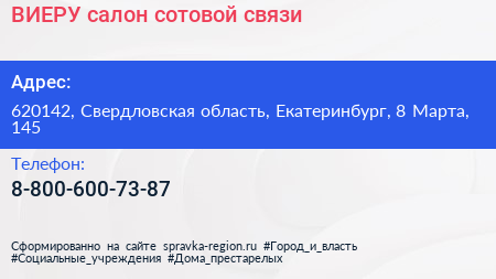 ВИЕРУ, салон сотовой связи по адресу 620142, Свердловская область, Екатеринбург, 8 Марта, 145 в дальнейшем Организация, размещена в следующих категориях: