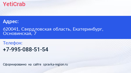 YetiCrab по адресу 620041, Свердловская область, Екатеринбург, Основинская, 7 в дальнейшем Организация, размещена в следующих категориях: