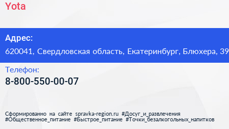 Yota по адресу 620041, Свердловская область, Екатеринбург, Блюхера, 39 в дальнейшем Организация, размещена в следующих категориях: