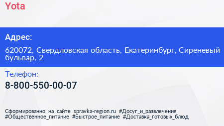 Yota по адресу 620072, Свердловская область, Екатеринбург, Сиреневый бульвар, 2 в дальнейшем Организация, размещена в следующих категориях: