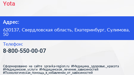 Yota по адресу 620137, Свердловская область, Екатеринбург, Сулимова, 50 в дальнейшем Организация, размещена в следующих категориях: